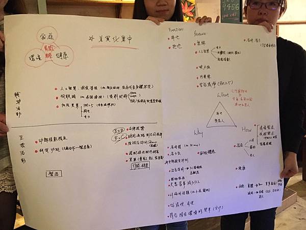 - 海報紙的內容,除了是小組討論時的筆記外,更是成果發表的重要道具,所以不只是將討論內容書寫在上面,更要直接構想如何呈現會有助於簡報時的使用,例如字太小,後面的觀眾會看不到的問題;密密麻麻的內容,也需要分段落來呈現。