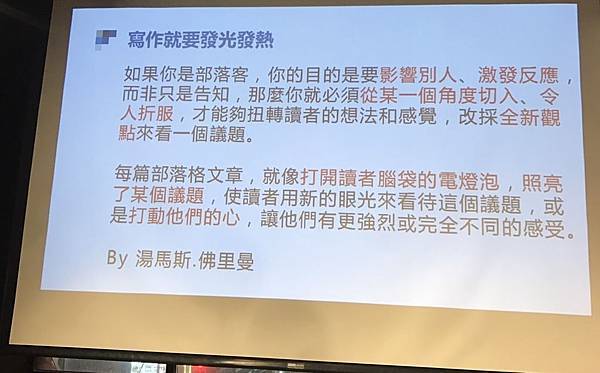 湯瑪斯.佛里曼的這段文字著實地把我打醒,點醒了我一直對於寫部落格像寫日記般的盲點, 之前有時候我會困惑, 到底我寫部落格文章的角度是要寫給自己看的生活紀錄呢? 還是寫給茫茫網友看的分享文?因為一直無法突破盲點, 所以過往撰述的角度一直在第一人稱與第三人稱之間變換著, 我想讀者也都跟著我一起迷航了吧。